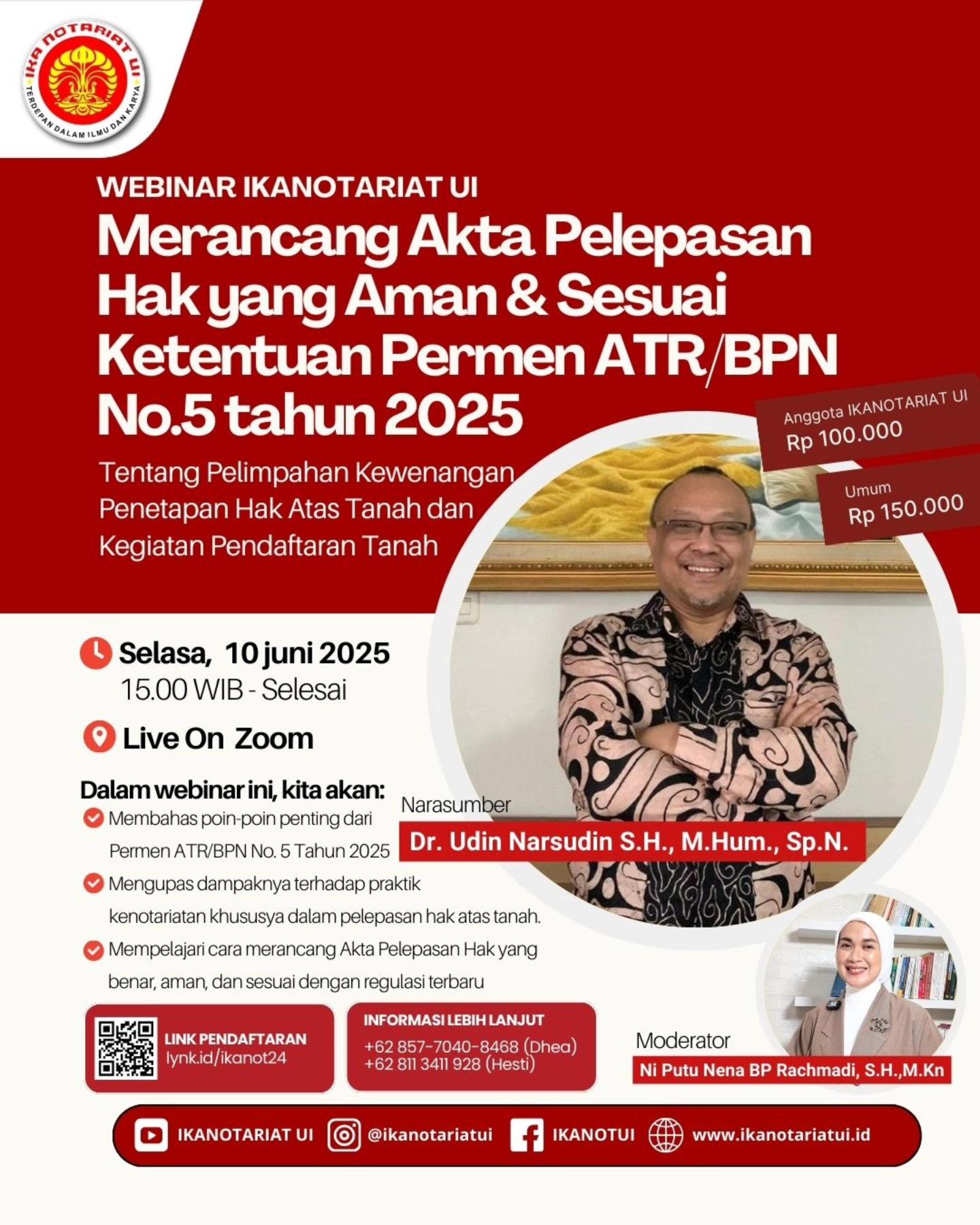 Catat tanggalnya dan pastikan kalian terdaftar ! Webinar ini terbuka untuk umum, dengan prioritas bagi alumni dan mahasiswa kenotariatan serta para Notaris dan PPAT di seluruh Indonesia.