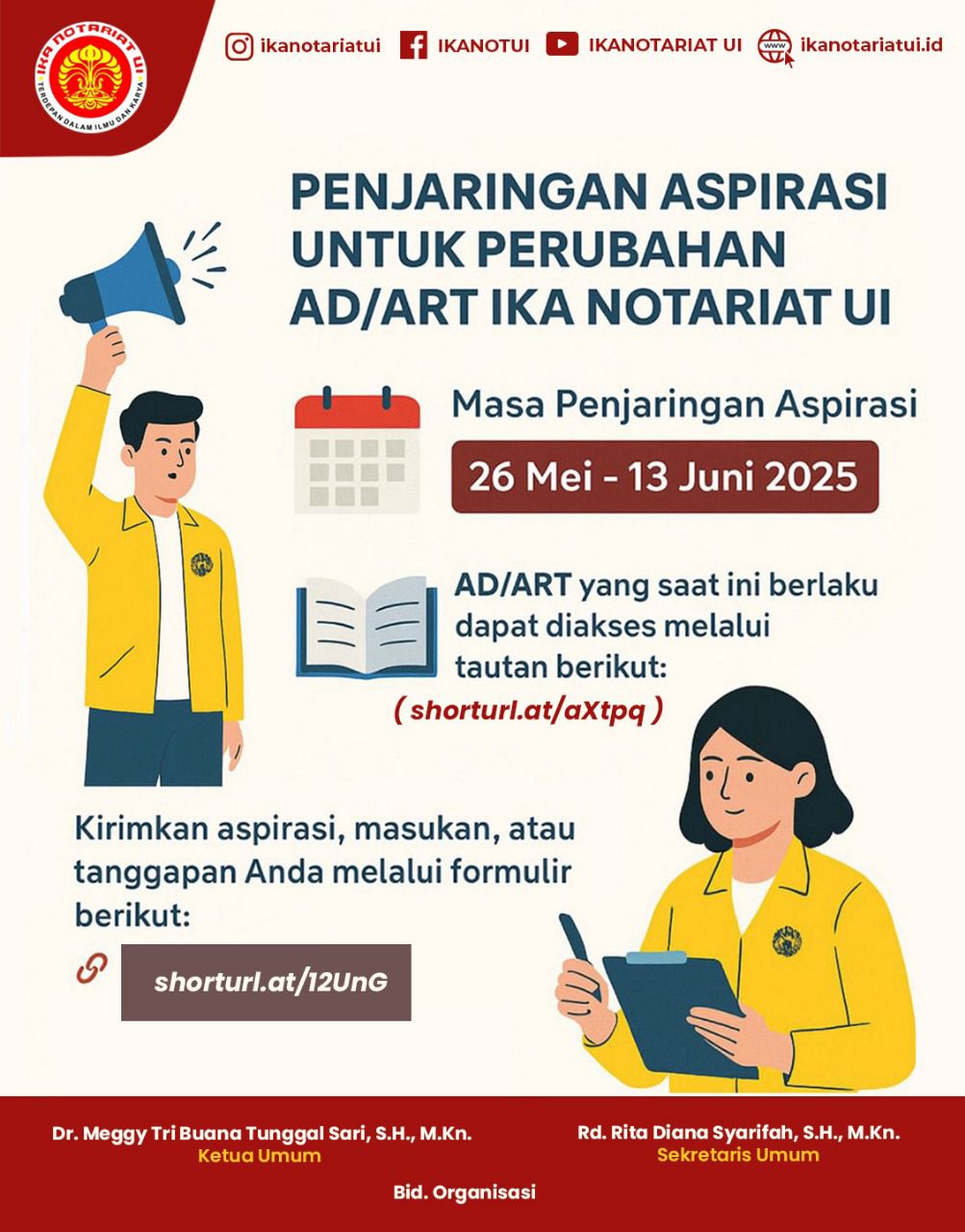 Saat ini, Ikatan Keluarga Alumni Notariat Universitas Indonesia (IKA Notariat UI) sedang membuka Penjaringan Aspirasi untuk Perubahan AD/ART IKA Notariat UI.